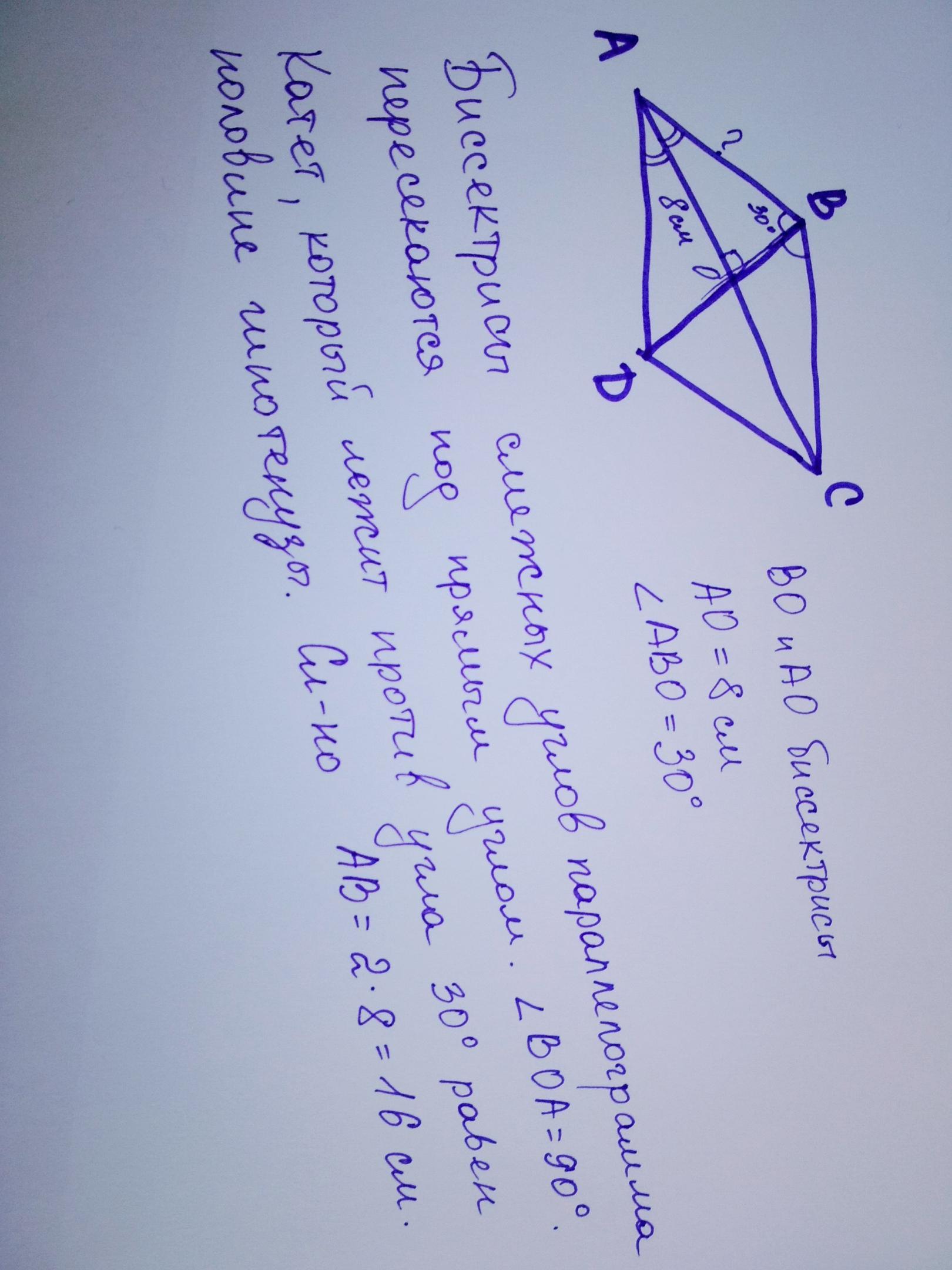 бесектрисы углов А и В параллеграма АBCD пересекаются в точке О найти сторону АВ параллелограма найдите сторону AB параллелограма если OA 8 сантиметров и угол ABO равен 30 градусов