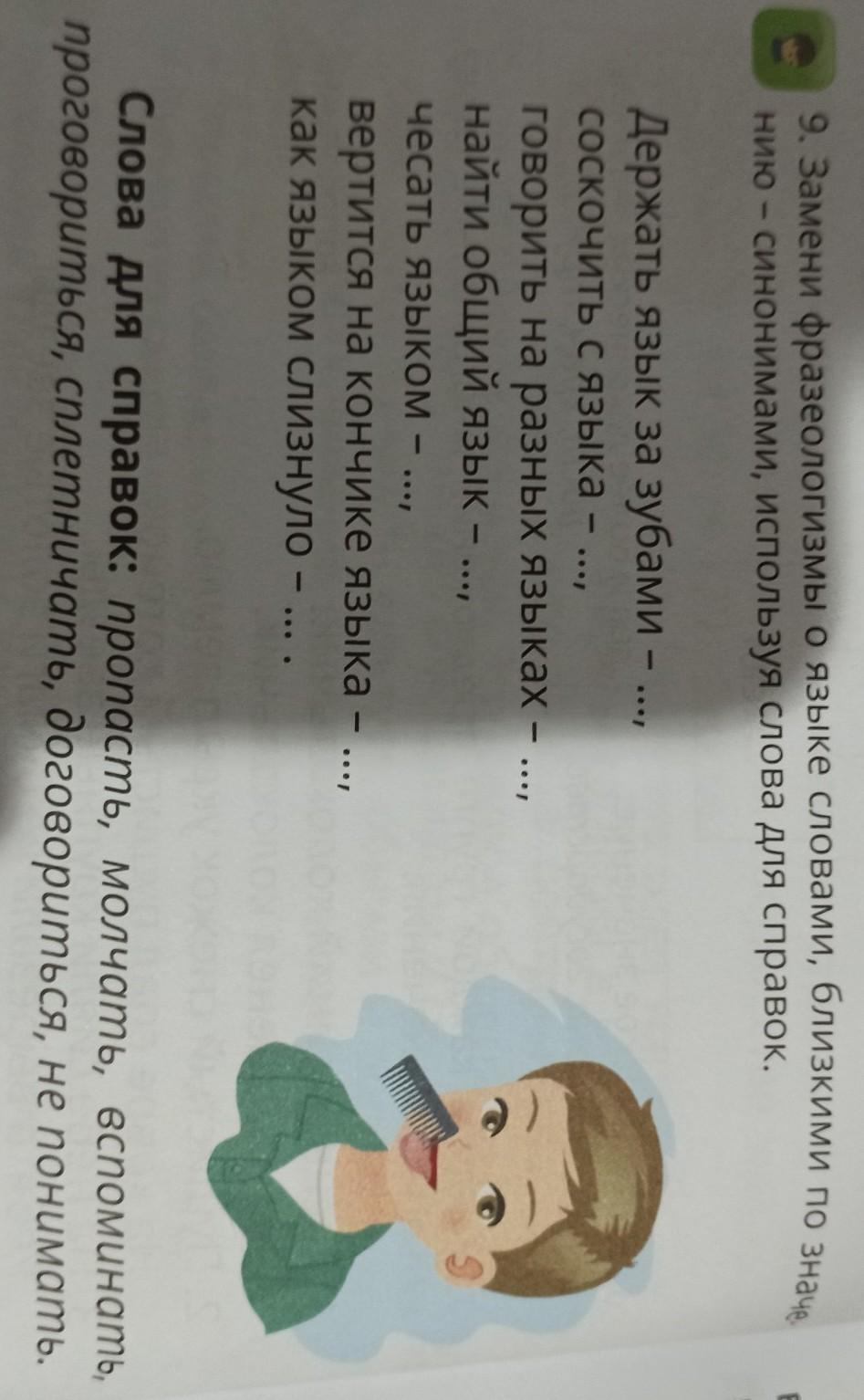 е Замени фразеологизмы о языке словами, близкими по значе.