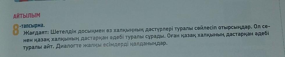 АЙТылым 8 - тапсырма . Жағдаят : Шетелдік досыңмен өз халқыңның дәстүрлері туралы сөйлесіп отырсыңдар . Ол се нен қазақ халқының дастарқан әдебі туралы сұрады . Оған қазақ халқының дастарқан әдебі туралы айт .|Диалогте жалқы есімдерді қолданыңдар .СКАЗАТЬ 8 - задача. Ситуация: вы говорите с иностранным другом о традициях вашего народа. Он спросил ее о манерах казахского народа за столом. Расскажите ему о манерах казахского народа за столом. Используйте в диалоге имена собственные.