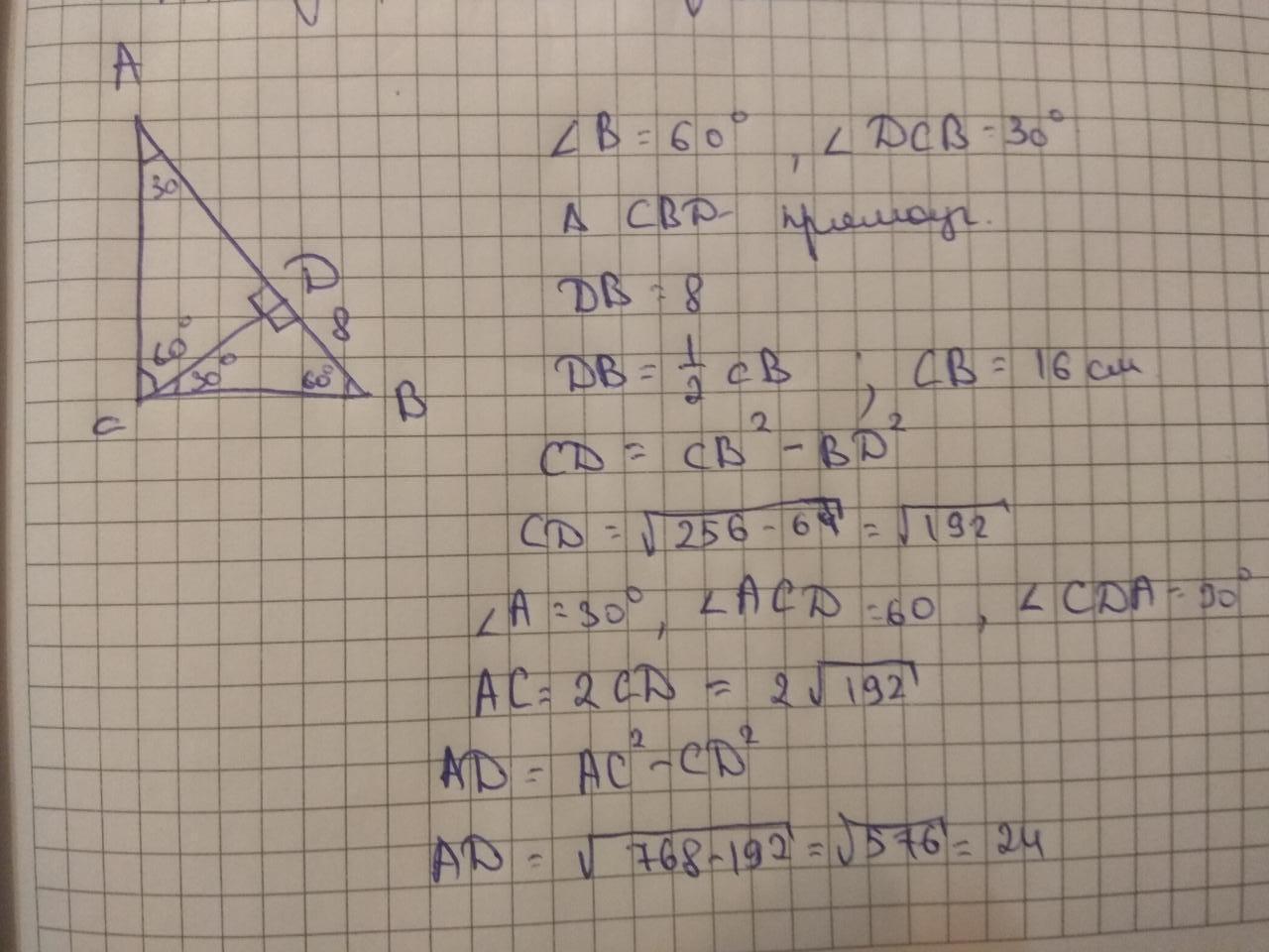 С= 90 градусов, угол В = 60 градусов, BD = 8 см. Найдите AD.