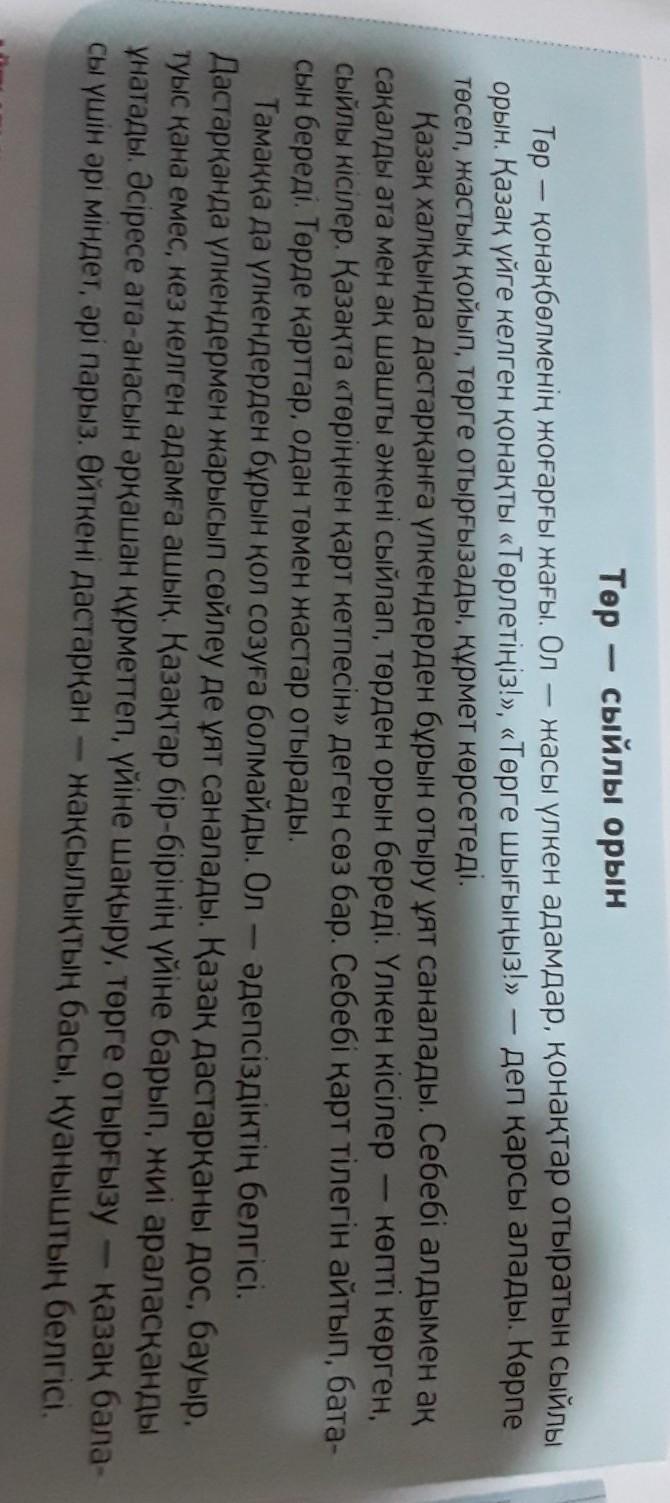 Казахскому народу стыдно сидеть перед взрослыми. Потому что прежде всего почитают аксакалов , бабушек и дают им место в торе. Взрослые - это люди , которое много повидали и которых уважают. По казахски есть поговорка не стареть. Потому что старик говорит о своих желаниях и благословляет. В почетных местах сидят пожилые, ниже него сидят молодые.