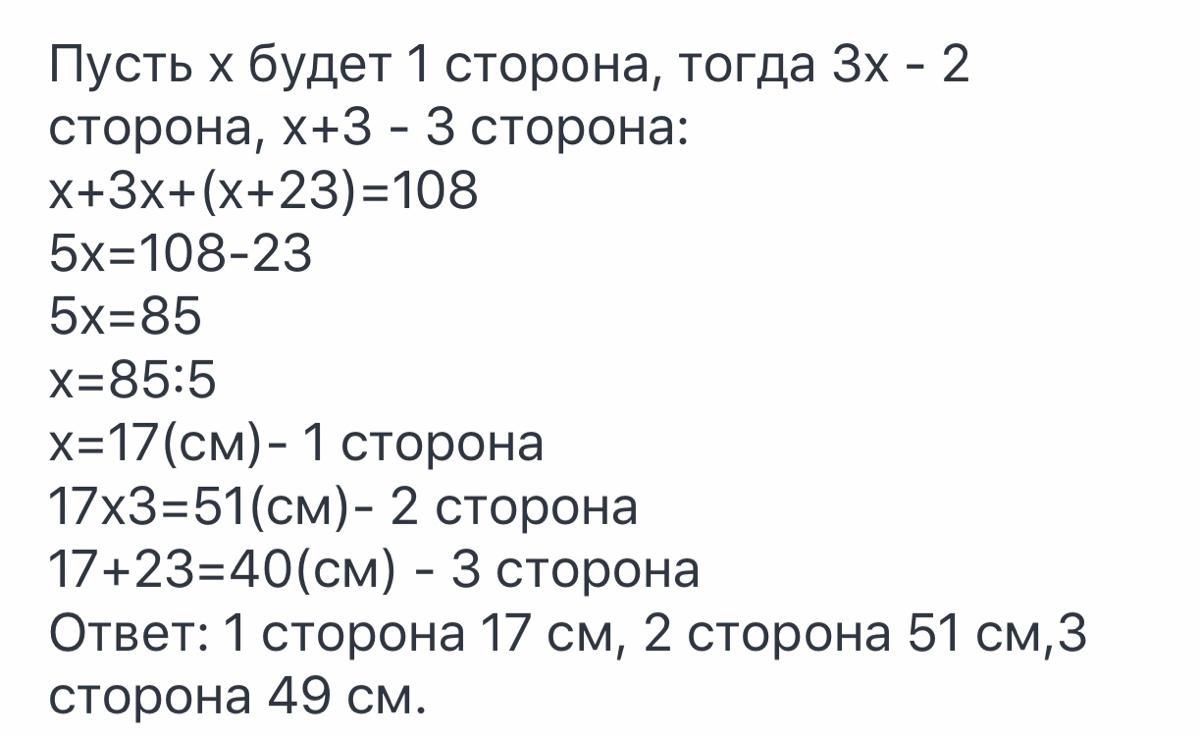 Одна зi сторiн трикутника в 3 рази менша від другої та на 23 см менша від третьої. Знайдіть сторони трикутника, якщо його периметр дорівнює 108 см