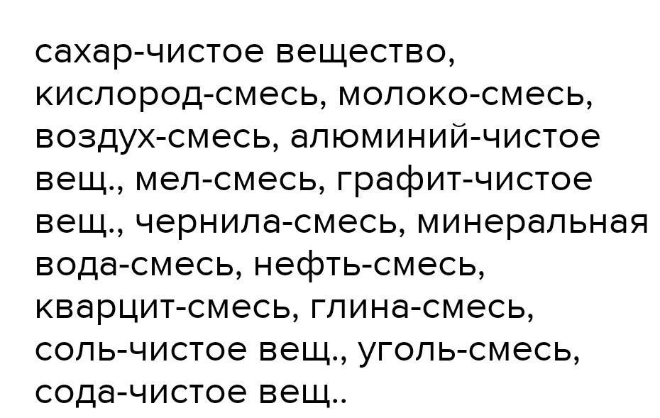 Что из перечисленного является веществом, а что смесью: почва, туман, цементный раствор, сахар, пыль, столовый уксус, золото, молоко, лимонад, спирт, сталь, кислород, воздух, нефть, алмаз, сточные воды, углекислый газ, выхлопные газы автомобиля, минеральная вода?