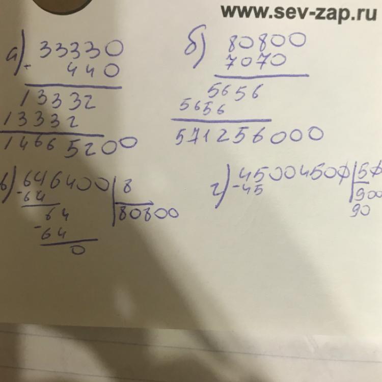 а) 33 330 . 440 б) 80 800 . 7070 в) 646 400 : 8 г) 45 004 500 : 50