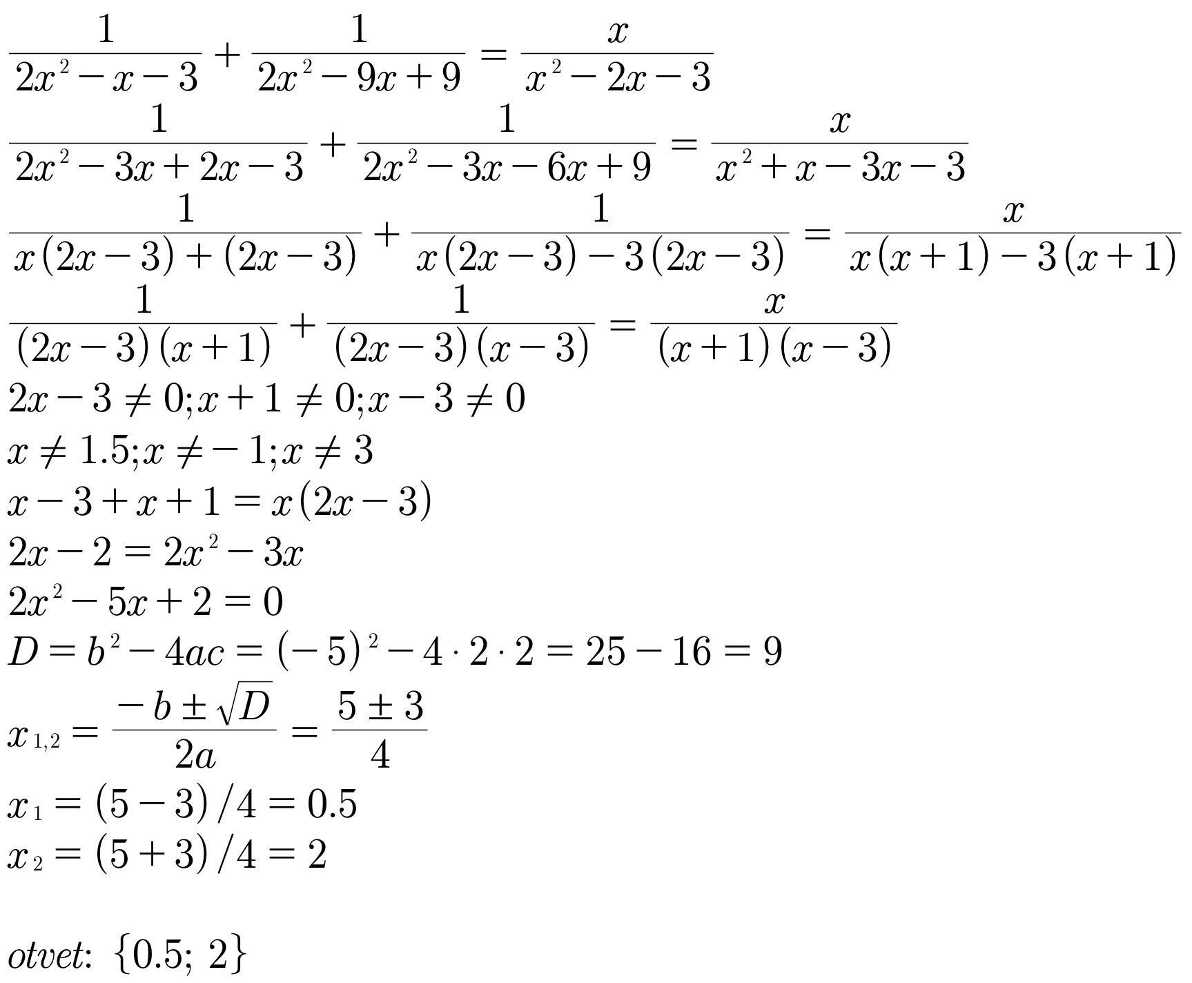 Условие такое:1/(2x^2-x-3+1/2x^2-9+9=x/x^2-2x-3