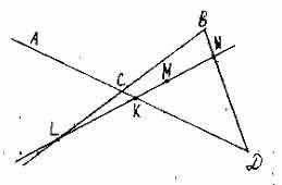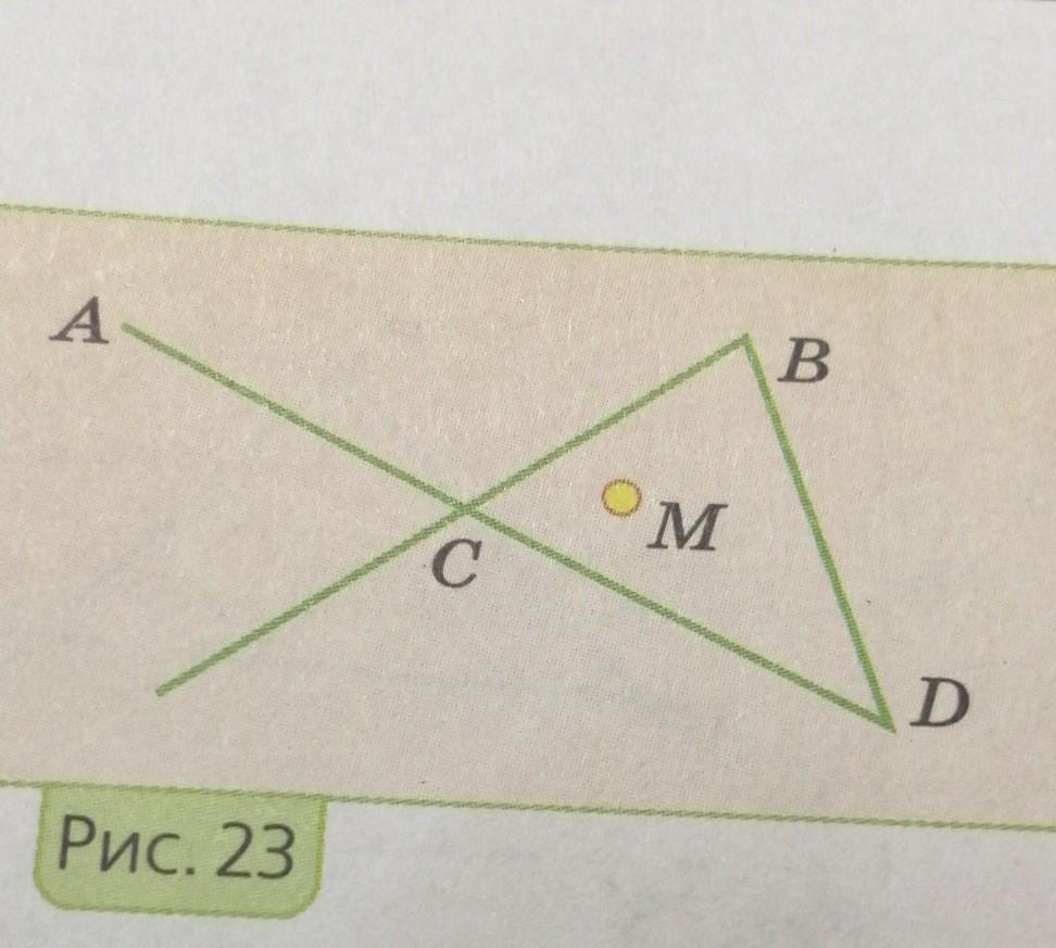 Перечертите рис 23 в тетрадь и отметьте точку N на отрезке BD так, чтобы прямая MN пересекала прямые AC и BC но не пересекала отрезок BC