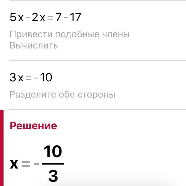 5/9x+17/9=2/9x+7/9 = 5/9x-2/9x=7/9-17/9 = 3/9x=10/9 = 1/3x=-10/9 = 9=-30x = x=-0/3
