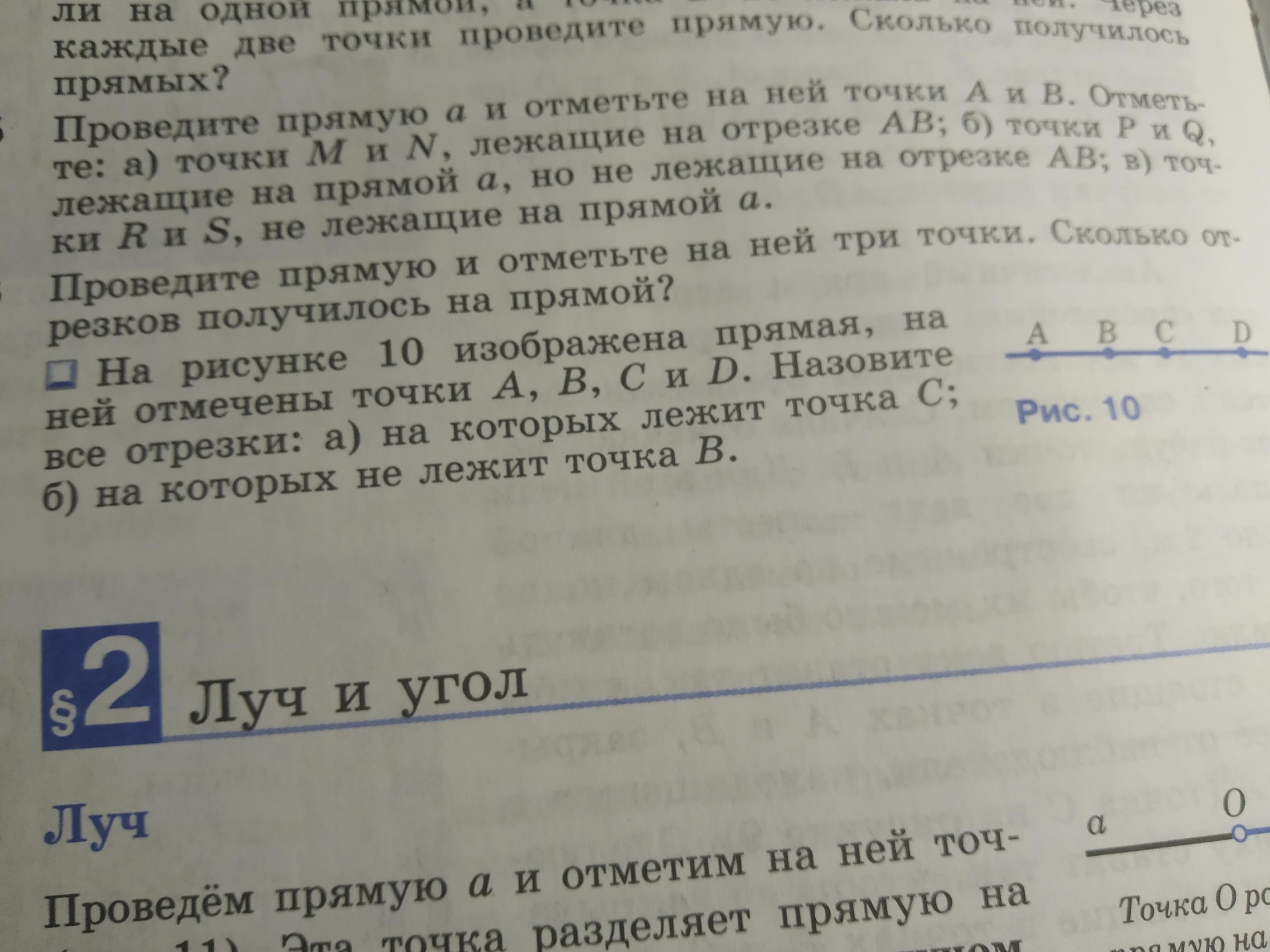 Геометрия 7 класс. На рисунке 10 изображена прямая, на ней отмечены точки A, B, C и D. Назовите все отрезки...