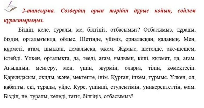 Біздің отбасымыз туралы білгіңіз келе ме? Біздің отбасымыз облыс орталығында тұрады. Үйіміз қаланың шетінде орналасқан. Атам мен әжем құрметті демалысқа шыққан. Әке-шешем шетелде жұмыс істейді. Үлкен ағам да, кіші ағам да ғылыми орталықта қызмет етеді. Інім мен қарындасым мектепте оқиды. Ағылшын тілін меңгеру үшін оларға мен көмектесіп жүрмін. Тұрмыс құрған әпкем үлкен екі қабатты үйде тұрады. Өзім университеттің үшінші курс студентімін. Біздің отбасымыз туралы тағы не білгіңіз келеді?