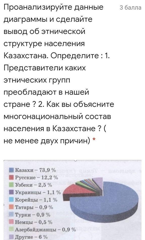 Проанализируйте данные диаграммы и сделайте вывод об этнической структуре населения Казахстана. Определите : 1. Представители каких этнических групп преобладают в нашей стране ? 2. Как вы объясните многонациональный состав населения в Казахстане ? ( не менее двух причин)