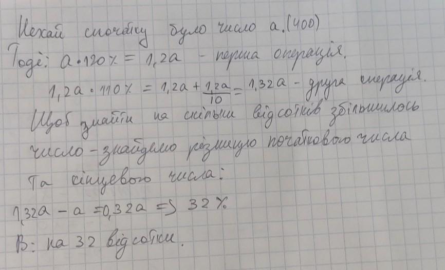 число 400 збільшили на 20%, а одержане число знову збільшили на 10%. На скільки відсотків збільшиши число 400?