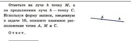 Отметьте на луче h точку М, а на продолжении луча h- точку С. Используя форму записи, введенную в задаче 10, опишите взаимное рас- положение точек А, М и С. Ответ.
