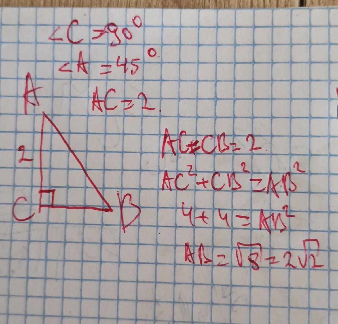 т.к. треуг.прямоуг.равнобедренный АС=СВ=2