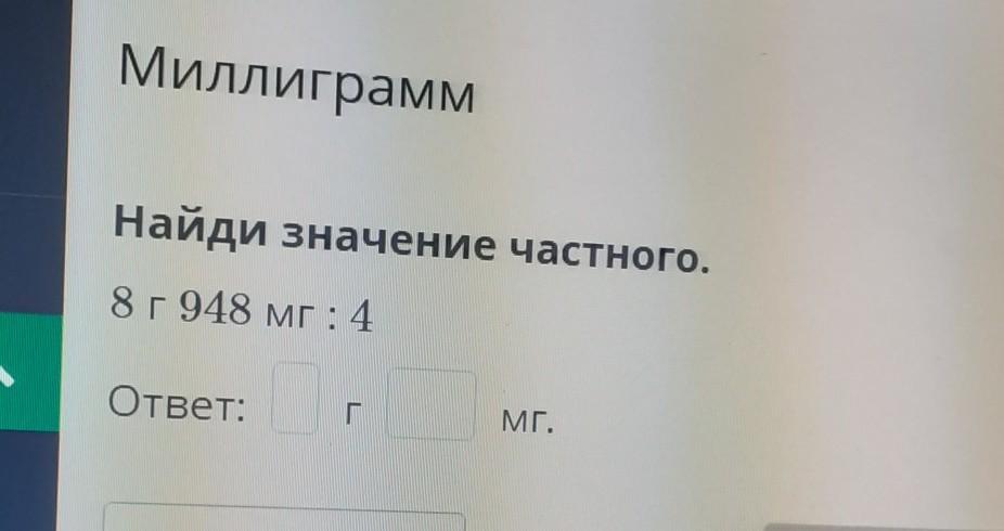 8 г 948 мг : 4 = 2 г 237 мг просто каждое число поделить на 4