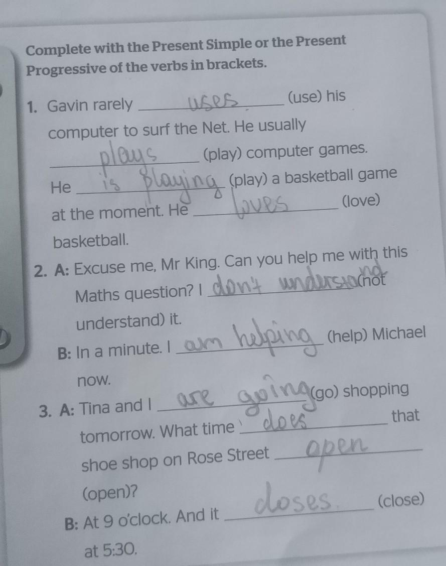 Complete with the Present Simple or the Present Progressive of the verbs in brackets . 1. Gavin rarely ( use ) his computer to surf the Net . He usually ( play ) computer games . He ( play ) a basketball game at the moment . He ( love ) basketball . 2. A : Excuse me , Mr King . Can you help me with this Maths question ? ( not understand ) it . B : In a minute . I ( help ) Michael now . 3. A : Tina and I ( go ) shopping tomorrow . What time that shoe shop on Rose Street ( open ) ? B : At 9 o'clock . And it ( close ) at 5:30 .