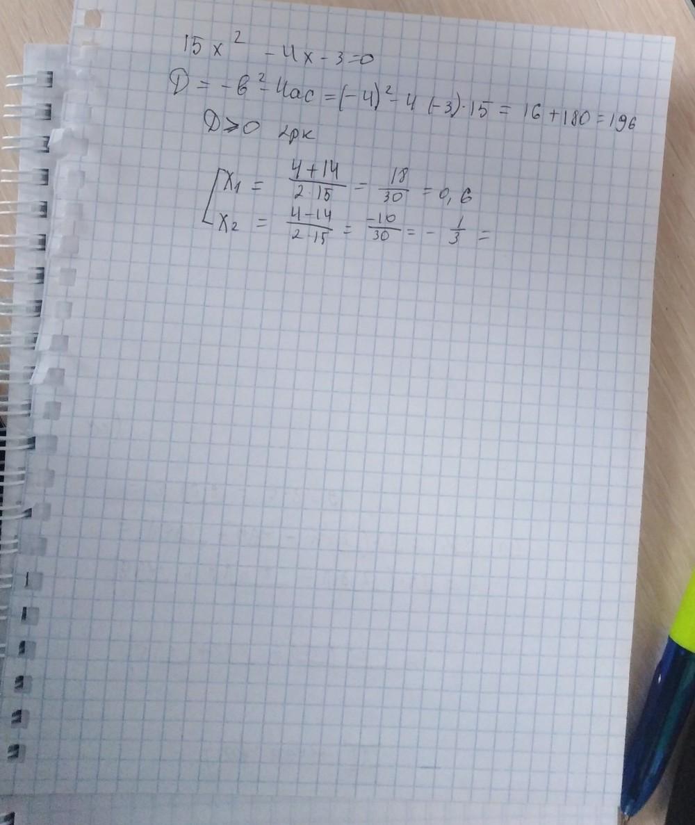 Ответ: дискриминант 16+4*15*3=16+180=196. Корни х1=(4+14)/30=18/30=3/5, х2=(4-14)/30=-1/3.