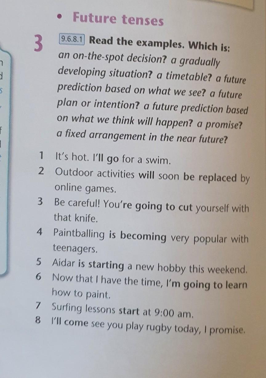 Read the examples. Which is an on-the-spot decision? a gradually prediction based on what we see? a future plan or intention? a future prediction based on what we think will happen? a promise? developing situation? a timetable? a future a fixed arrangement in the near future?