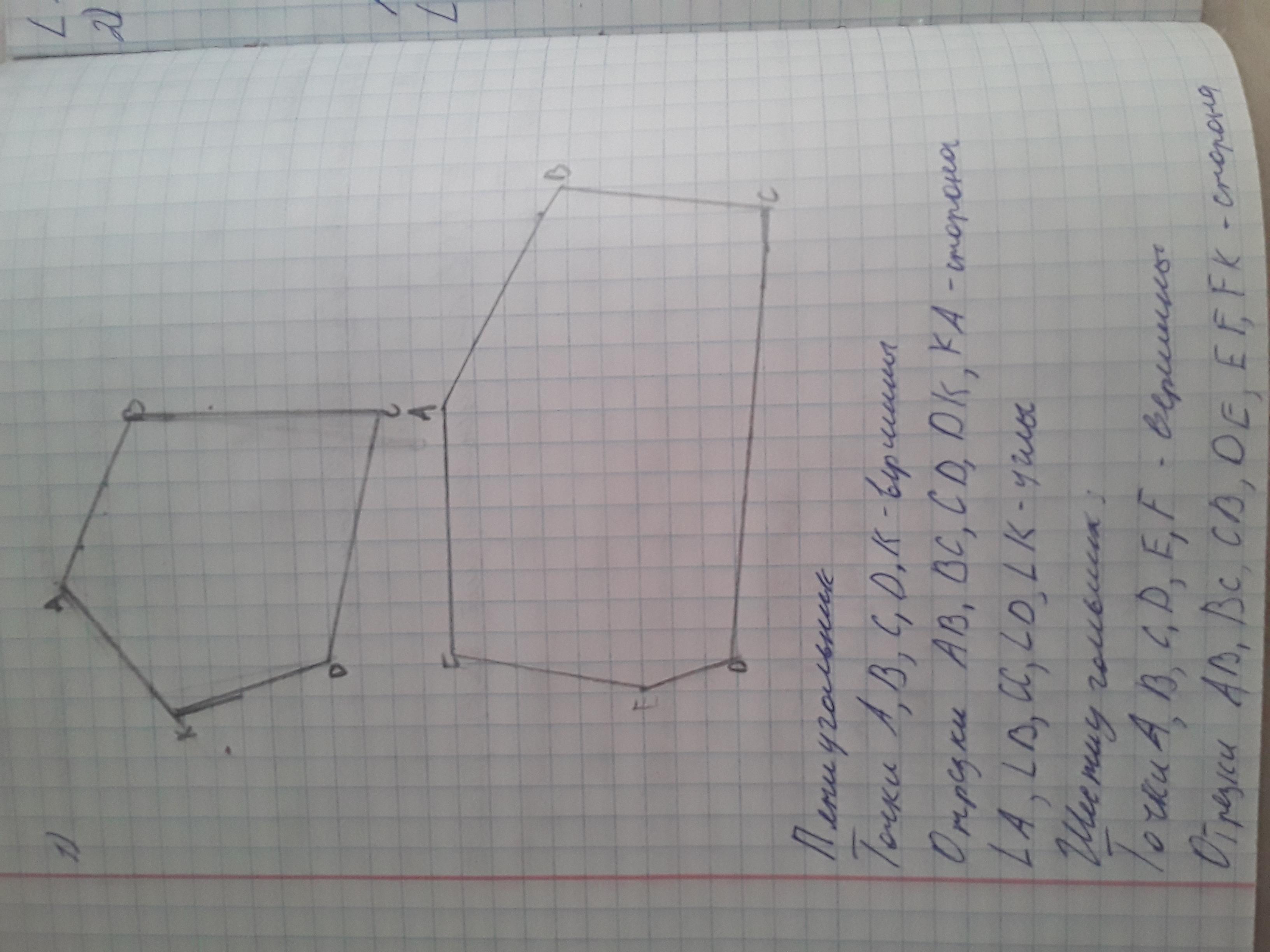 Постройте выпуклый: 1.пятиугольник 2.шестиугольник Укажите их элементы. 2)Постройте какой-нибудь четырехугольник ABCD,укажите его противоположные стороны и углы. 1
