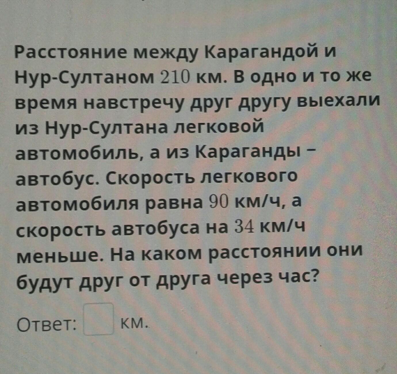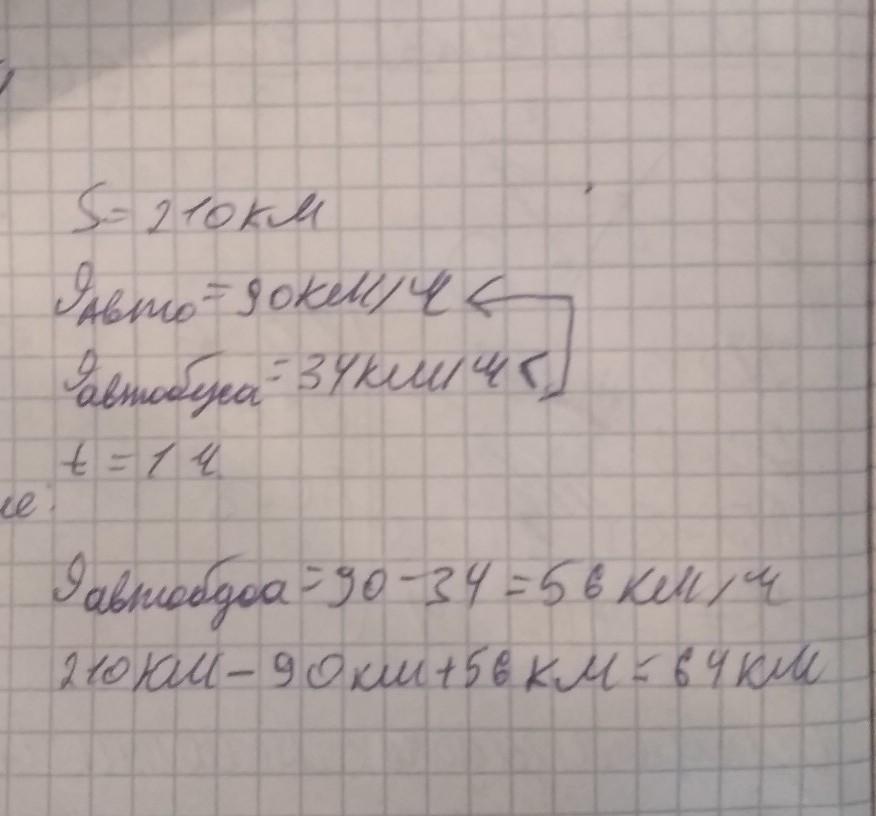 я не помню как обозначить оставшееся расстояние 1 вычеслишь скорость автобуса она на 34 меньше машины 90-34=56 потом от общего пути отними их общую скорость 210-90+56=64 км это и будет ответ