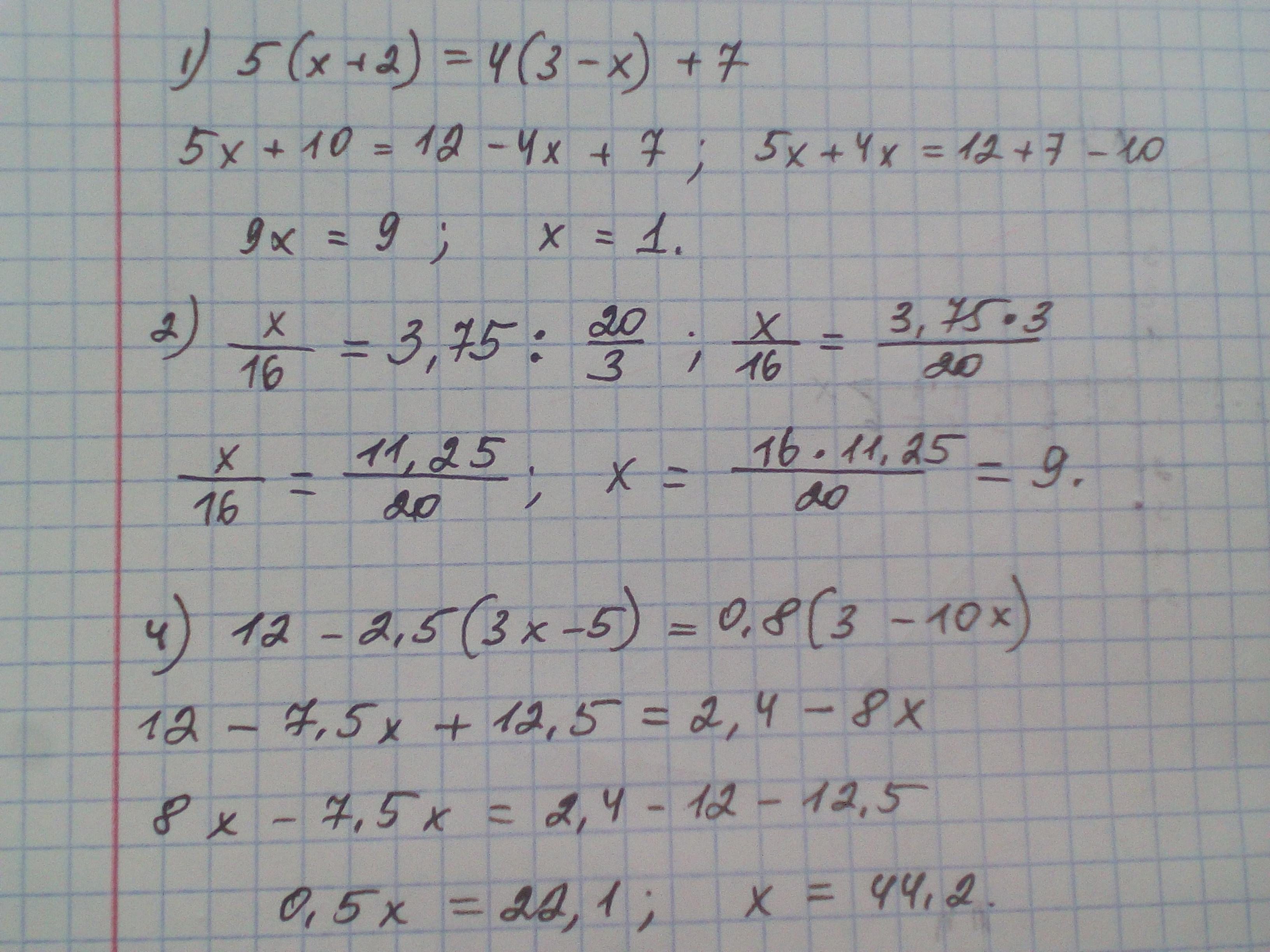 1)5 (х + 2) = 4 (3-х) + 7=x=1