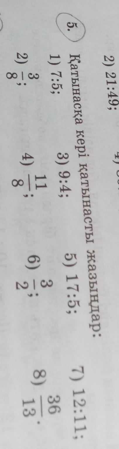 1=7/5(запиши в виде дроби то что первое я пишу это числитель а второе знаменатель) 2=3:8(запиши это как в первом но с этими числами) 3=9/4 4=11:8 5=17/5 6=3:2 7=12/11 8=36:13