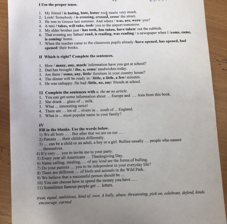 1.hates, is crossing, were, will take, has taken, was reading/came, had opened