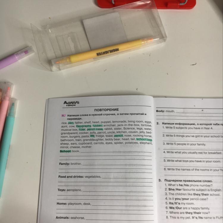 Ответ: School: book, pen, school bag, pencil, ruler pencil, case, Science, Geography, rubber,