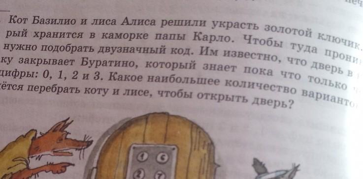 МОГОТИ ПОЖАЛУЙСТА!ДАМ 10 БАЛЛОВ! кот Базилио и Лиса Алиса решили украсть Золотой ключик который хранится в каморке папы Карло. чтобы туда проникнуть нужно подобрать двузначный код. им известно, что дверь в уаморке закрывает Буратино который знает пока что только 4 цифры:0,1 2,3. Какое наибольшее количество вариантов придется перебирать коту и Алисе? чтобы открыть дверь