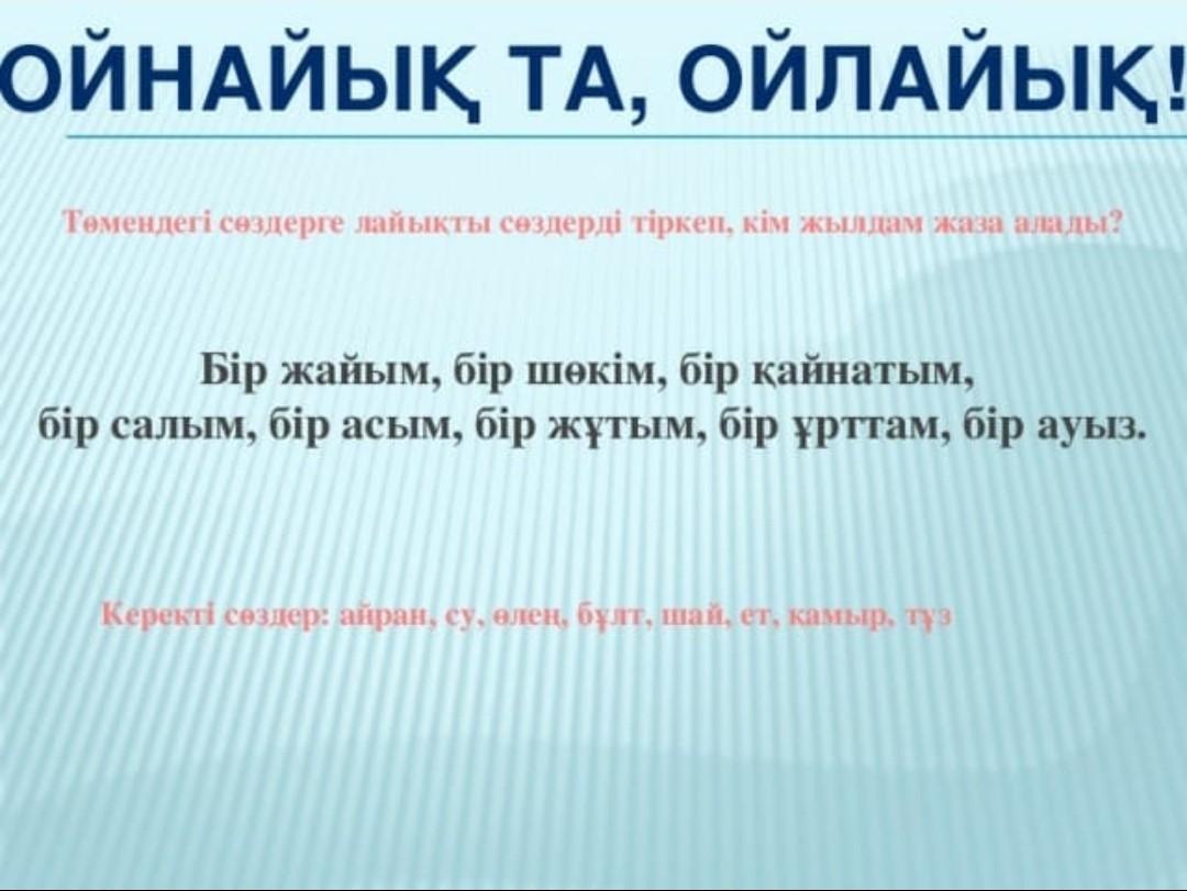 Бір ауыз өлең,бір жұтым су,бір ұрттам айран,бір қайнаттым шай,бір шөкім тұз,бір асым ет,бір салым қамыр,бір жайым бұлт