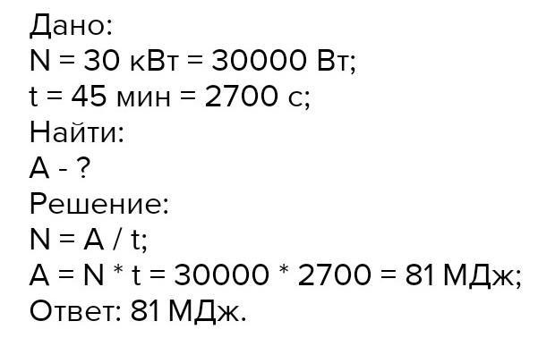 Пліз Самоскид розвиває потужність 30 к Вm. Яку роботу він виконує протягом 45 хв?