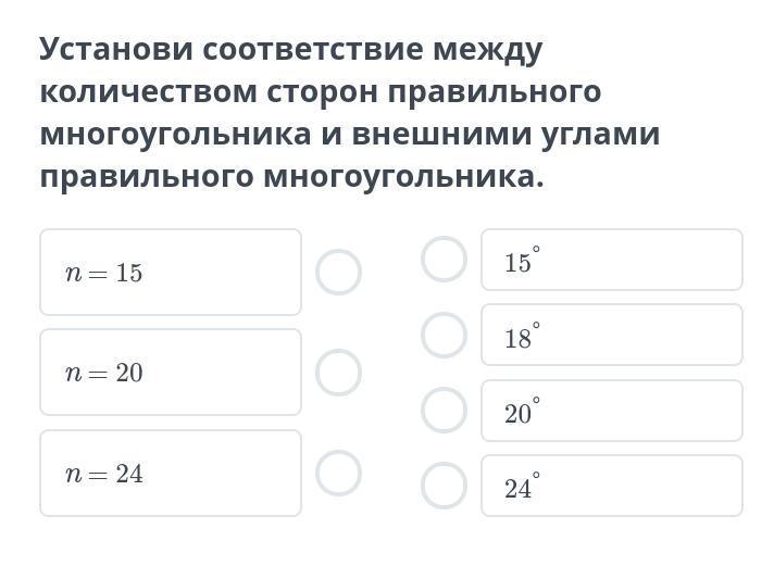 30 баллов Установи соответствие между количеством сторон правильного многоугольника и внешними углами правильного многоугольника