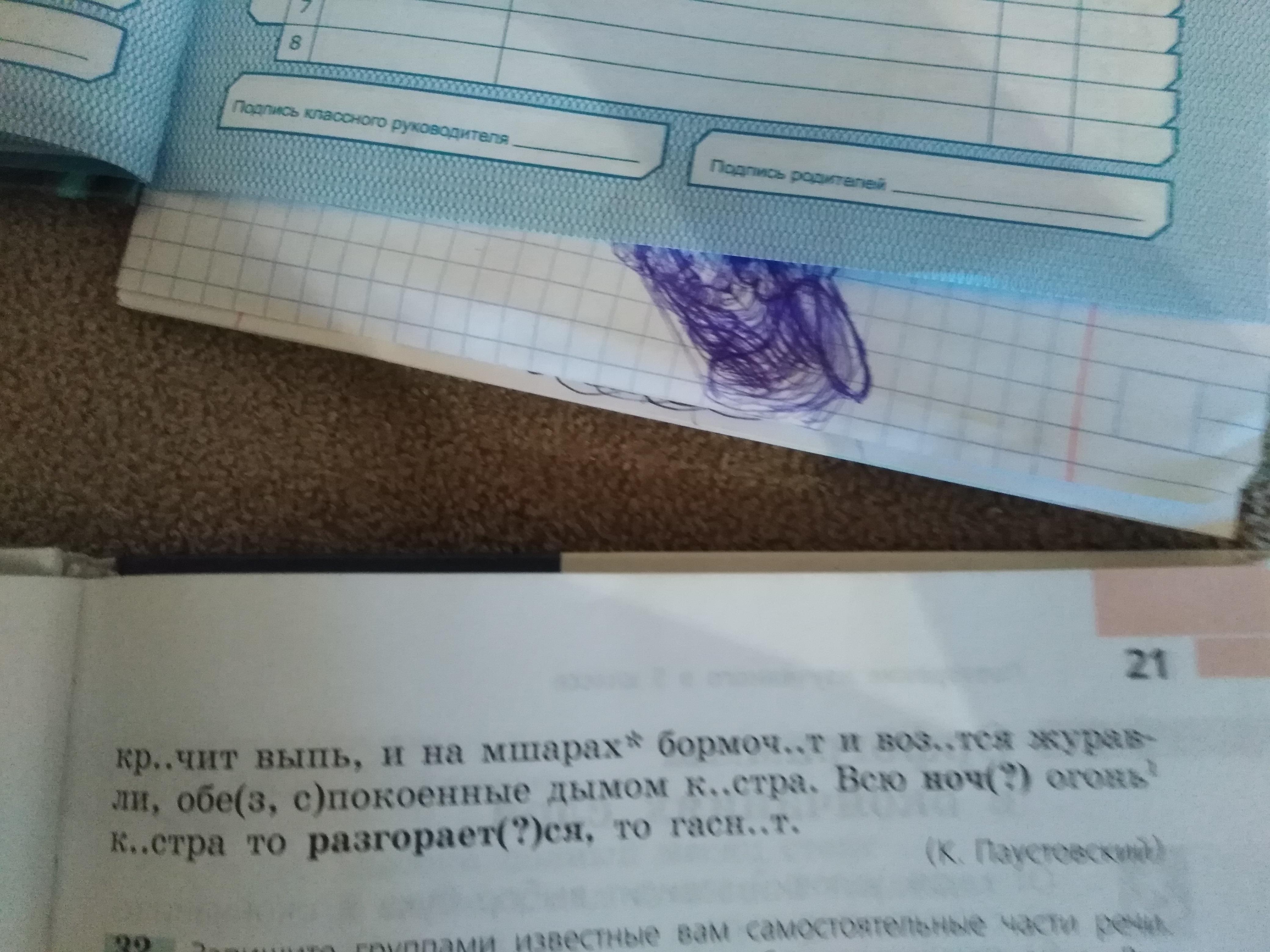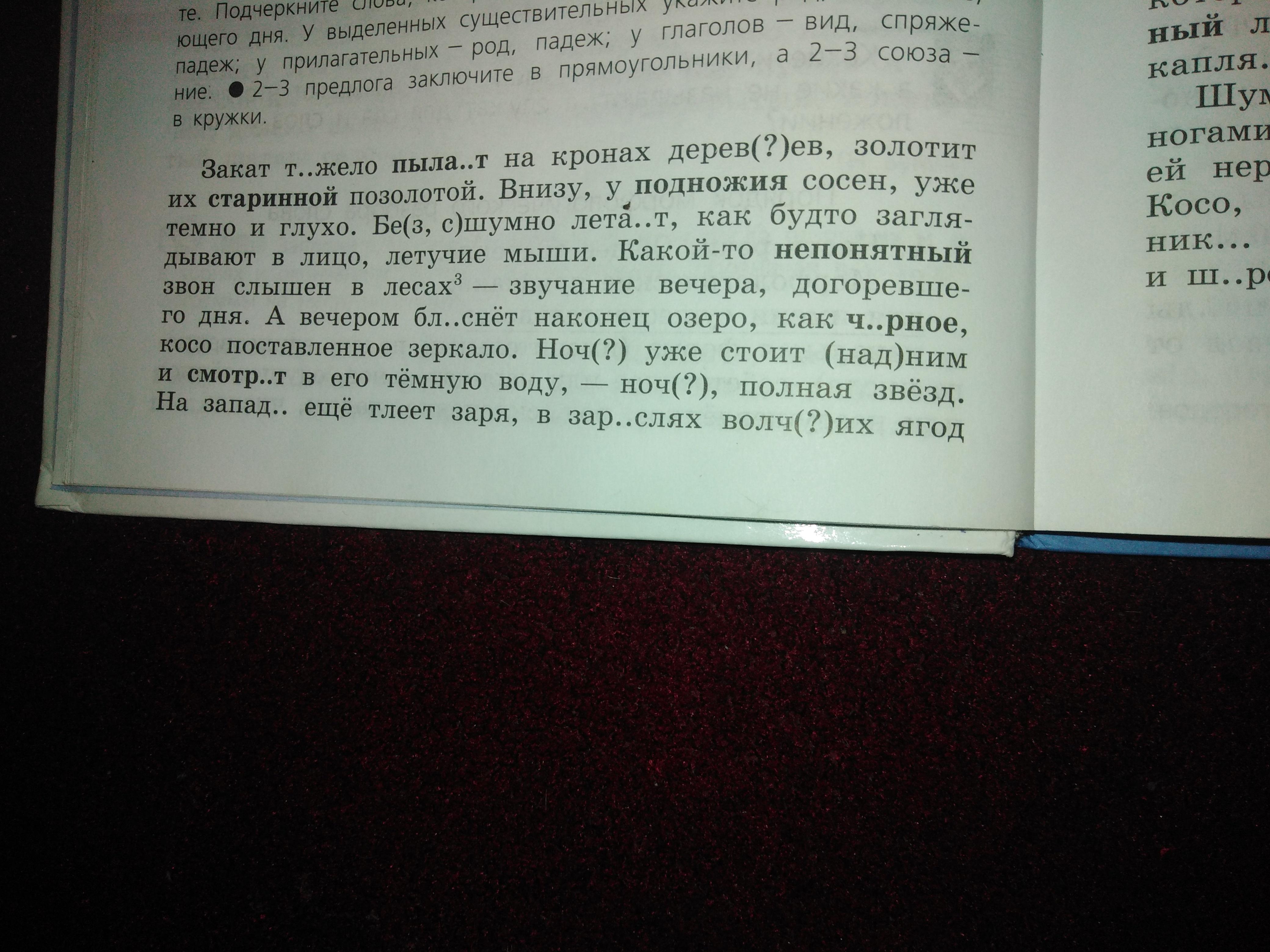 тяжело (тяжесть), пылает (1 спр), деревьев, бесшумно (корень начинается на глухую согласную), летает (1 спр), блеснёт (блеск), чёрное (чернеть), ночь (3 скл, ж.р), над ним (раздельно, предлог и местоимение), смотрит (2 скл), ночь (3 скл, ж.р), западе (П.п, ед.ч), зарослях (корень рос, нет суффикса а), волчьих (мягкий разделительный знак), кричит (крик), бормочет (1 спр), возится (2 спр), обеспокоенные, костра, ночь (3 скл, ж.р), разговается (что делает?) гаснет (1 спр)