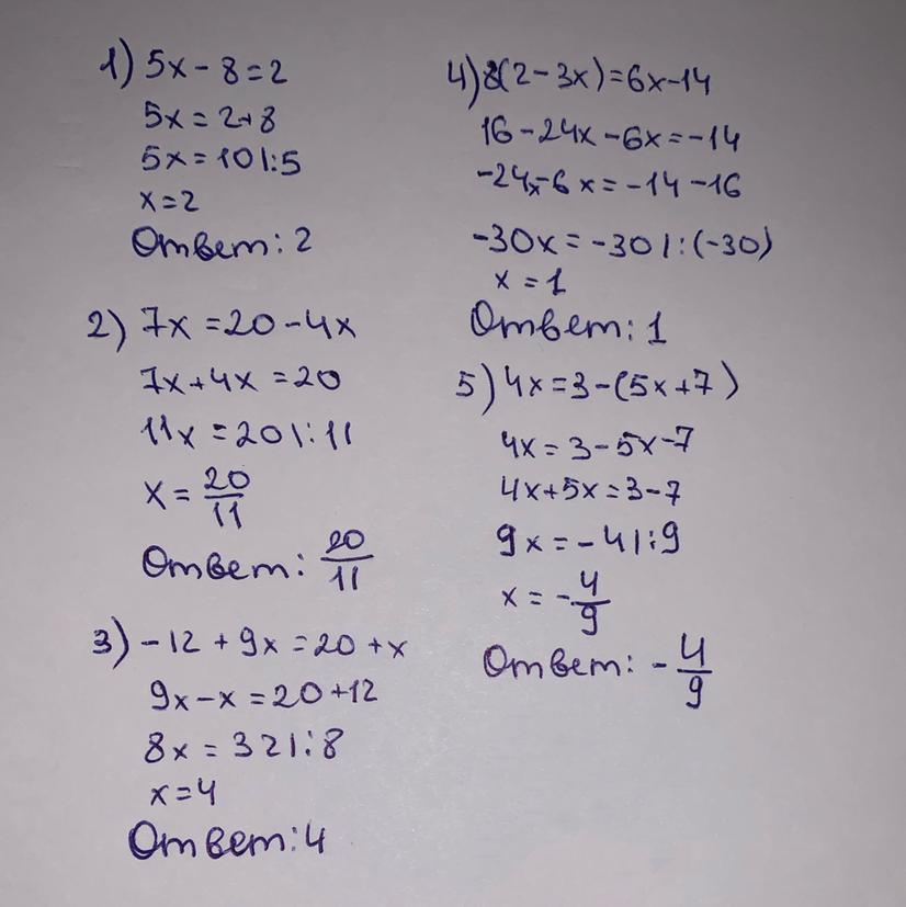 Решите примеры пожалуйста, срооочно! 1)5x-8=2 2)7x=20-4x 3)-12+9x=20+x 4)8(2-3x)=6x-14 5)4x=3-(5x+7) 6)-5y:(-1,2)=5:(-0,4)