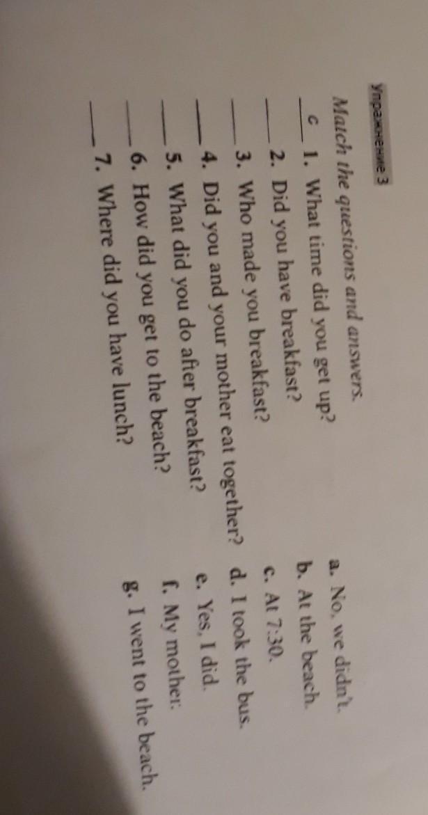 Match the questions and answers. a. No, we didn't. 1. What time did you get up? 2. Did you have breakfast? b. At the beach. 3. Who made you breakfast? c. At 7:30. 4. Did you and your mother eat together? d. I took the bus. 5. What did you do after breakfast? 6. How did you get to the beach? 7. Where did you have lunch? e. Yes, I did. f. My mother. g. I went to the beach.