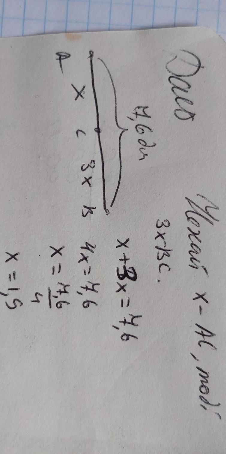 точка C належить відрізку AB довжина якого 7,6 дм. Визначте довжини відрізків AC і BC, якщо AC менший за BC у 3 рази