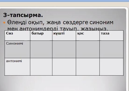 батыр синоним- қаһарман, ер, ержүрек, антоним– қорқақ, сужүрек