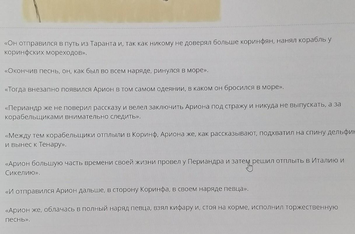 Ответ: "Арион же, облачась в полный наряд певца, взял кифару и, стоя на корме, исполнил торжественную песнь".