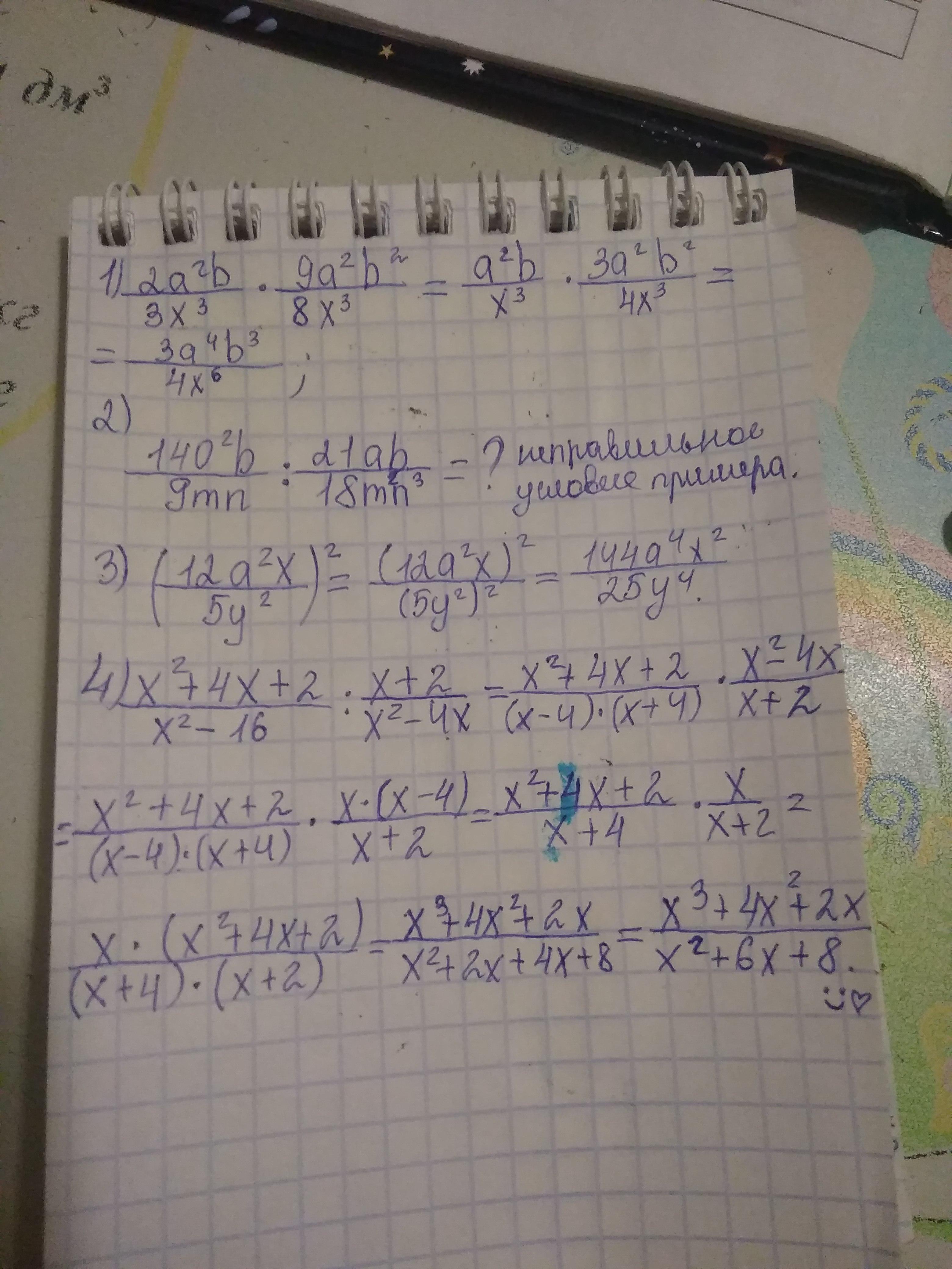 Помогите решить примеры : 1.) 2а²b/3x³ · 9a²b²/8x³ 2.) 140²b/9mn : 21ab/18m²n³ 3.) ( 12a²x/5y²)² 4.) x²+4x+2/x²-16 : x+2/x²-4x