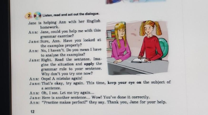 2. Слухайте, читайте та розігруйте діалог. Джейн допомагає Енн у виконанні домашнього завдання з англійської мови. Енн: Джейн, не могли б ви допомогти мені з цим завданням з граматики? Джейн: Звичайно, Енн. Чи правильно ви розглянули приклади? Енн: Ні, ні. Ви маєте на увазі, що я повинен проаналізувати приклад? Джейн: Так. Прочитайте речення. Уявіть ситуацію та застосуйте граматичне правило до свого речення. Чому б вам не спробувати зараз? Енн: Оопал Знову міатаке! Джейн: Нічого страшного, спробуйте ще раз. Цього разу не стежте за предметом речення. Енн: О, розумію. Дозвольте мені спробувати ще раз ... Джейн: Ось ще одне речення .. Ого! Ви зробили це правильно. Енн: "Практика робить ідеальним!" вони кажуть. Дякую, Джейн за допомогу.