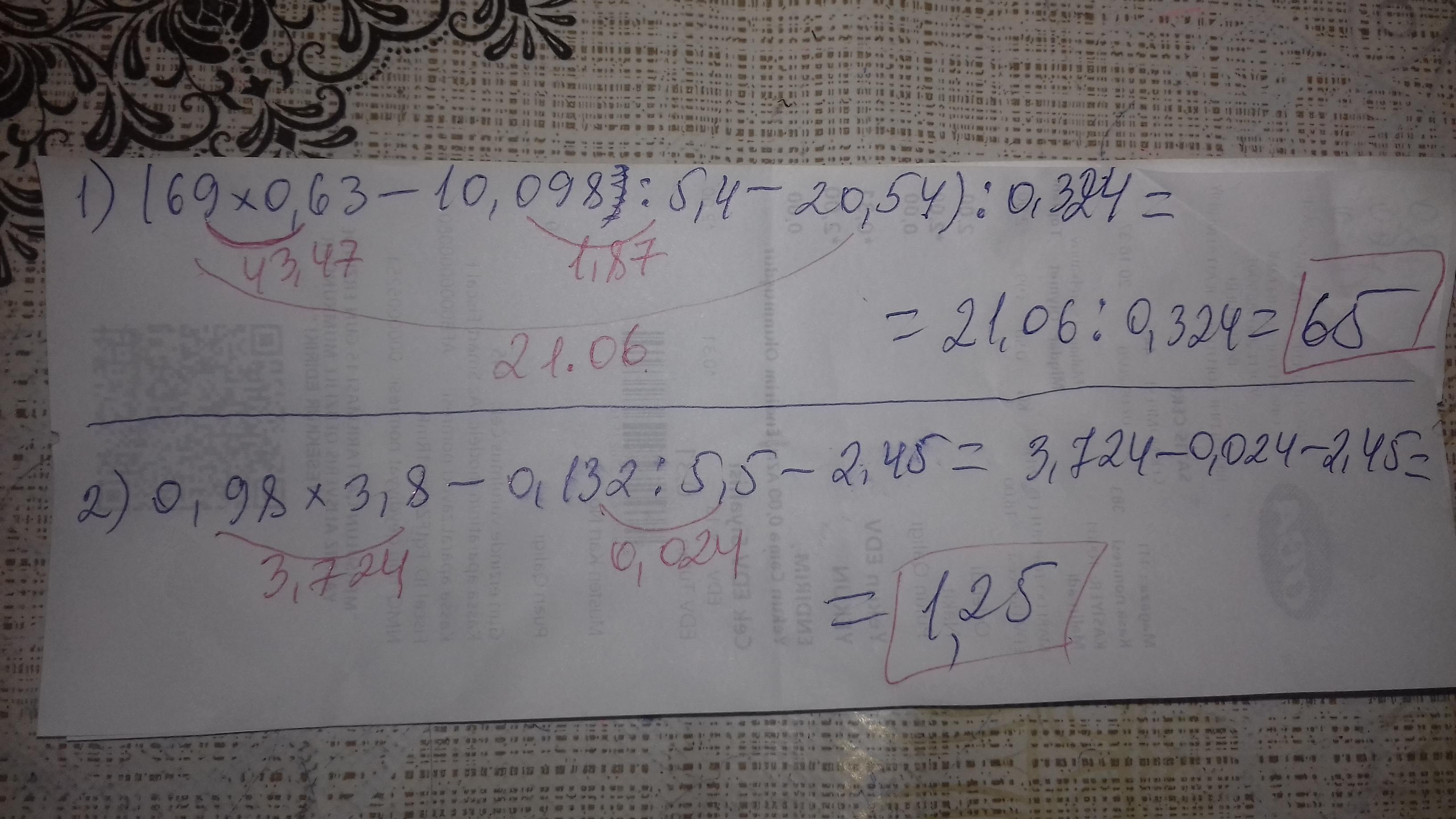 Решите примеры(каждое действие отдельно): 1) (69 х 0,63 - 10,098 : 5,4 - 20,54) : 0,324 = ? 2) 0,98 х 3,8 - 0,132 : 5,5 - 2,45 = ?