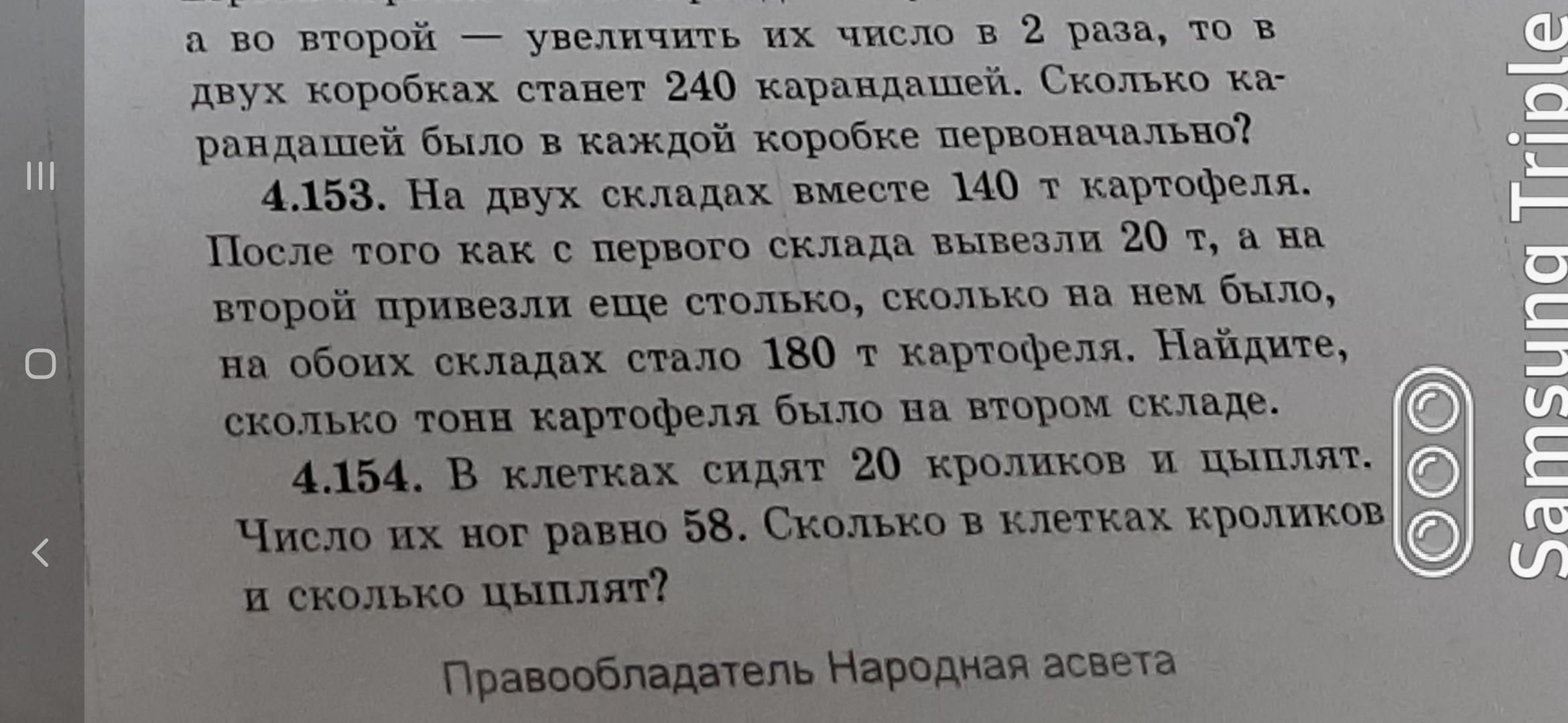 4.153:На двух складах вместе 140 т картофеля. После того как с первого склада вывезли 20 т, а на второй привезли еще столько, сколько на нем было, на обоих складах стало 180 т картофеля. Найдите, сколько тонн картофеля было на втором складе.