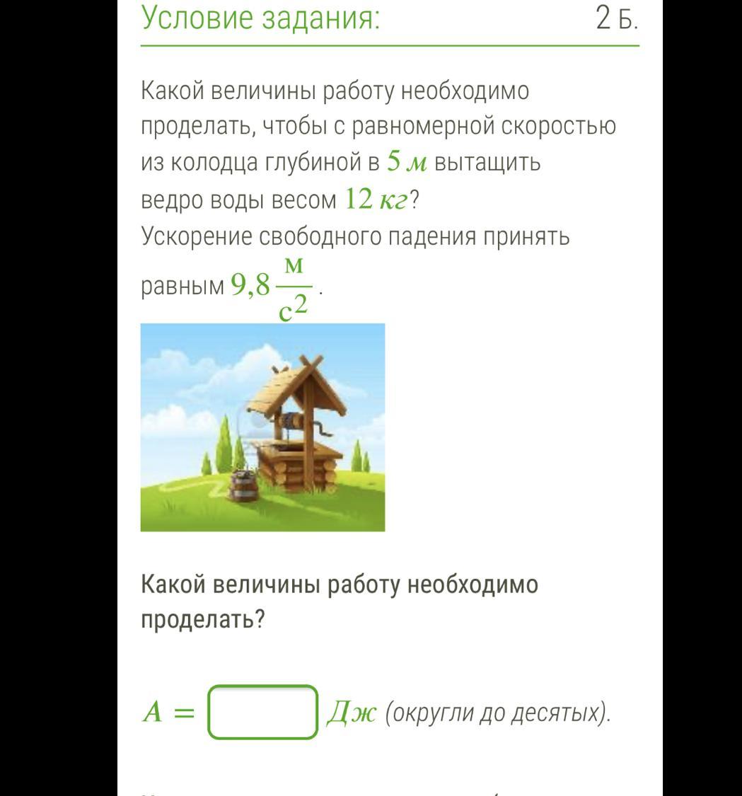 Какой величины работу необходимо проделать, чтобы с равномерной скоростью из колодца глубиной в 5 м вытащить ведро воды весом 12 кг?