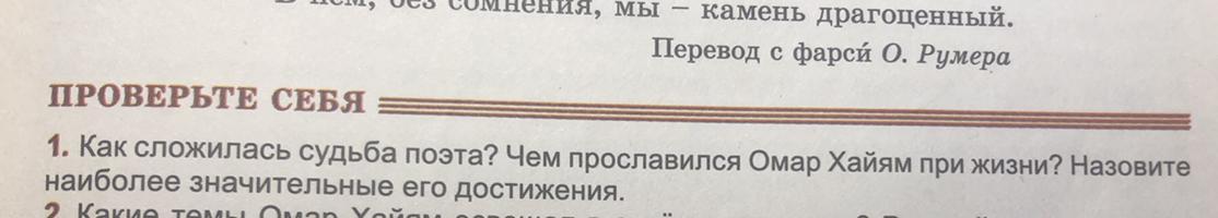 Гийяс-ад-Ди́н Абу-ль-Фатх Ома́р ибн-Эбрахи́м Хайя́м Нишапури́ (перс. غیاث الدین ابوالفتح عمر بن ابراهیم خیام نیشابورﻯ), Ома́р Хайя́м (عمر خیام); 18 мая 1048, Нишапур — 4 декабря 1131[1], там же) — персидский и таджикский философ, математик, астроном и поэт[2].Внёс вклад в алгебру построением классификации кубических уравнений и их решением с помощью конических сечений. Известен во всём мире как философ и выдающийся поэт, автор цикла философских рубаи. Омар Хайям также известен созданием самого точного из ныне используемых календарей[3]. Учениками Хайяма были такие учёные, как Музаффар аль-Асфизари и Абдуррахман аль-Хазини.Родился в городе Нишапур, который находится в Хорасане (ныне иранская провинция Хорасан-Резави). Омар был сыном палаточника, также у него была младшая сестра по имени Аиша. В 8 лет начал глубоко заниматься математикой, астрономией, философией. В 12 лет Омар стал учеником Нишапурского медресе. Позднее обучался в медресе Балха, Самарканда и Бухары. Там он с отличием окончил курс по мусульманскому праву и медицине, получив квалификацию хаки́ма, то есть врача[4]. Но медицинская практика его мало интересовала. Изучал сочинения известного математика и астронома Сабита ибн Курры, труды греческих математиков.