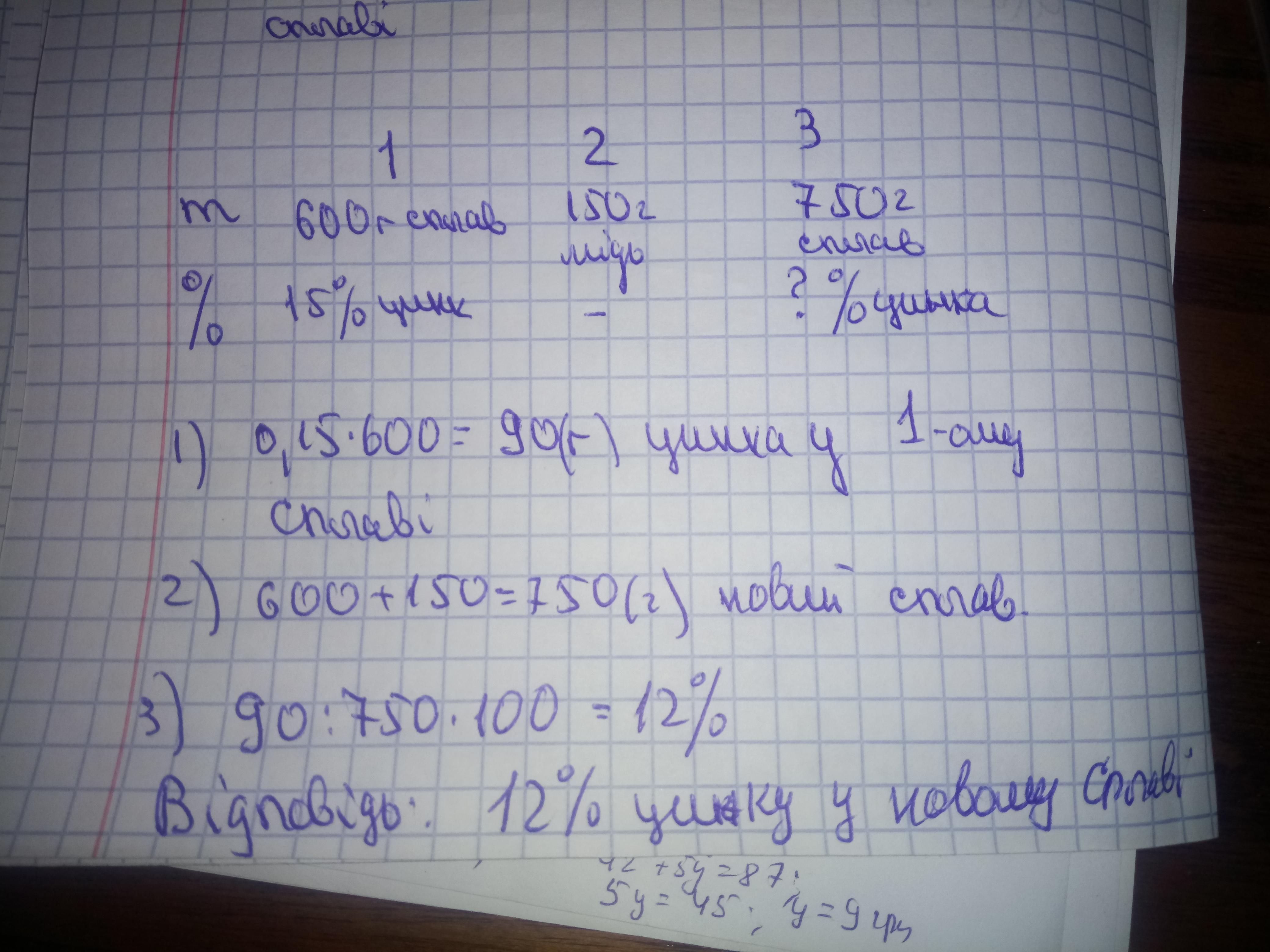 Будь ласка допоможіт. Сплав міді й цинку має масу 600 г і містить 15% цинку .Додавши до сплаву ще 150 г міді, одержали новий новий сплав Знайдіть відсотковий вміст цинку в новому сплаві.