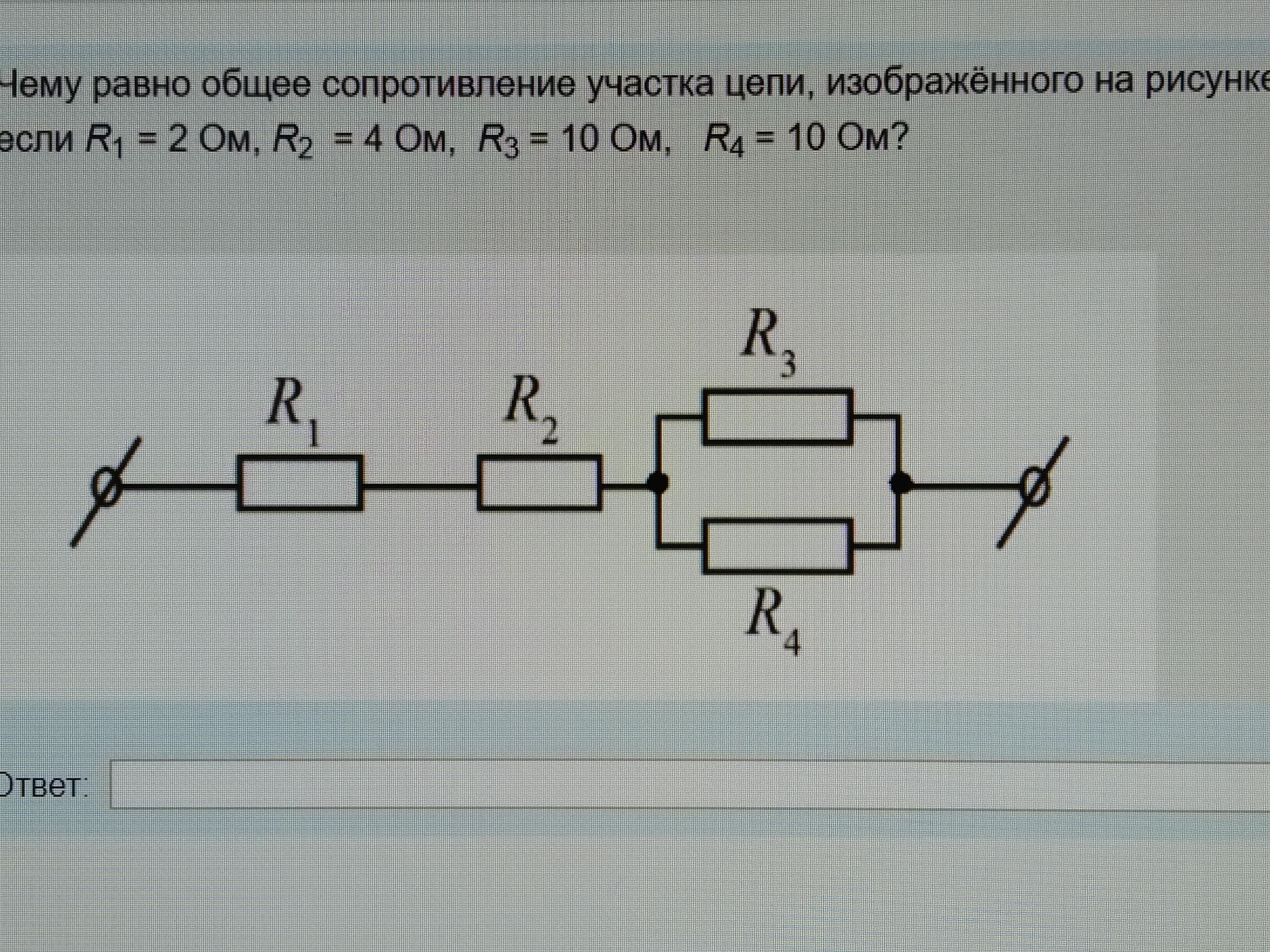 35б. Чему равно общее сопротивление участка цепи, изображенного на рисунке, если R1 = 2 Ом, R2 = 4 ОМ, R3 = 10 ОМ, R4 = 10 Ом