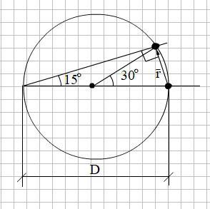 Перемещение тела r - катет, лежащий против угла в 15° в прямоугольном треугольнике, гипотенуза которого равна диаметру окружности.