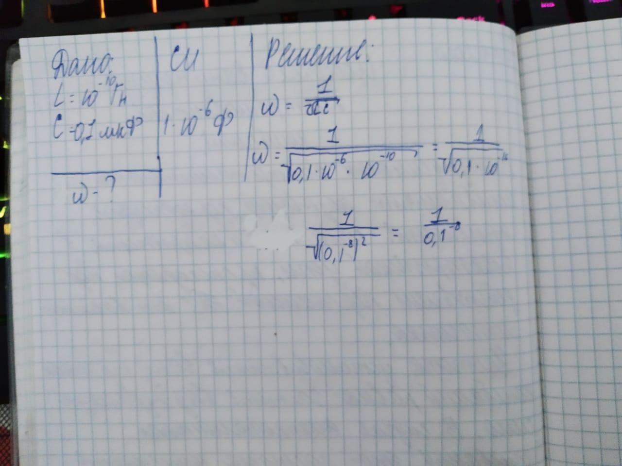 Определите частоту колебаний, созданных генератором на транзисторе. Колебательный контур состоит из конденсатора емкостью С = 0,1 мкФ и катушки индуктивностью L = 10^–10 Гн (десять в минус десятой степени)