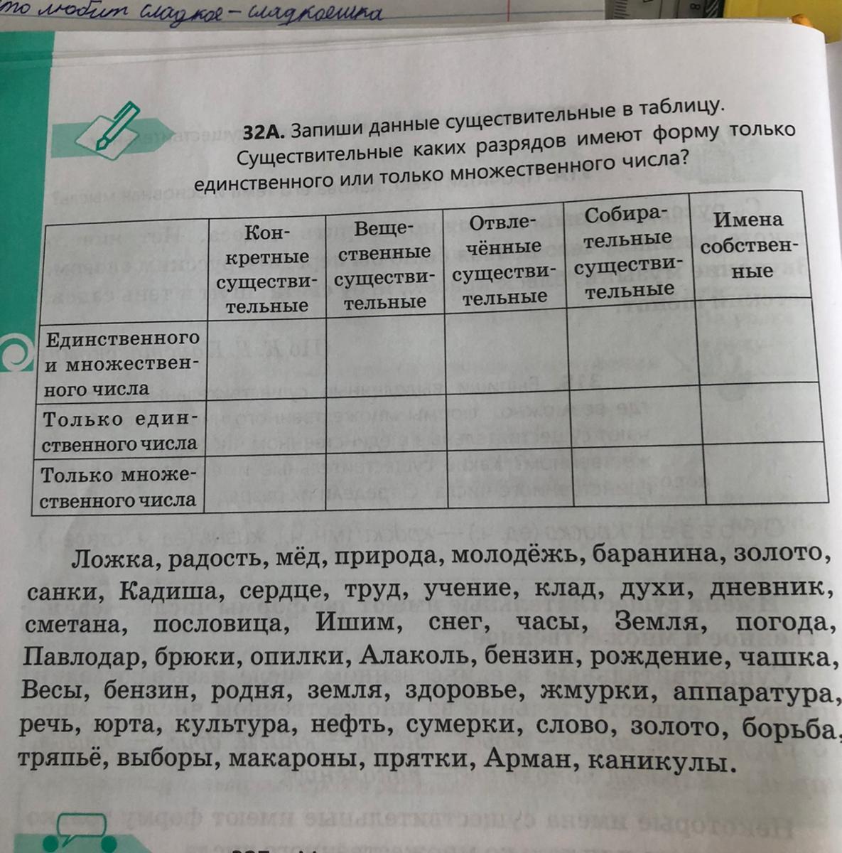 Запиши данные существительные в таблицу.Существительные каких разрядов имеют форму только единственного или только множественного числа