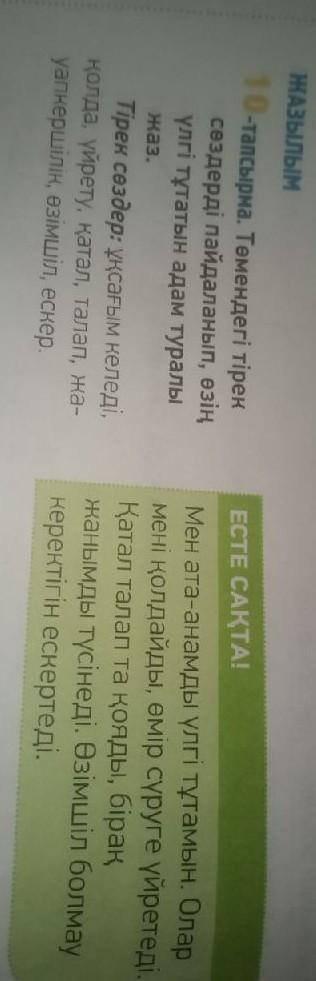 Мен өзімнің анамды үлгі тұтамын. Анам барлығын үйретеді. бала кезімде анама еліктеп ұқсағым келетін. Анам талап ететін нәрселер: жауапкершілік, тәртіпті болу, алдамау, өзімшіл болмау. қатал мінезі бар еді. қолдан келгенше бәрін үйрететін.