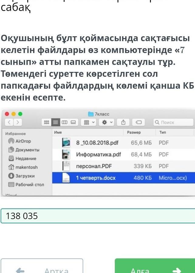Оқушының бұлт қоймасында сақтағысы келетін файлдары өз компьютерінде «7 сынып» атты папкамен сақтаулы тұр. Төмендегі суретте көрсетілген сол папкадағы файлдардың көлемі қанша КБ екенін есепте.